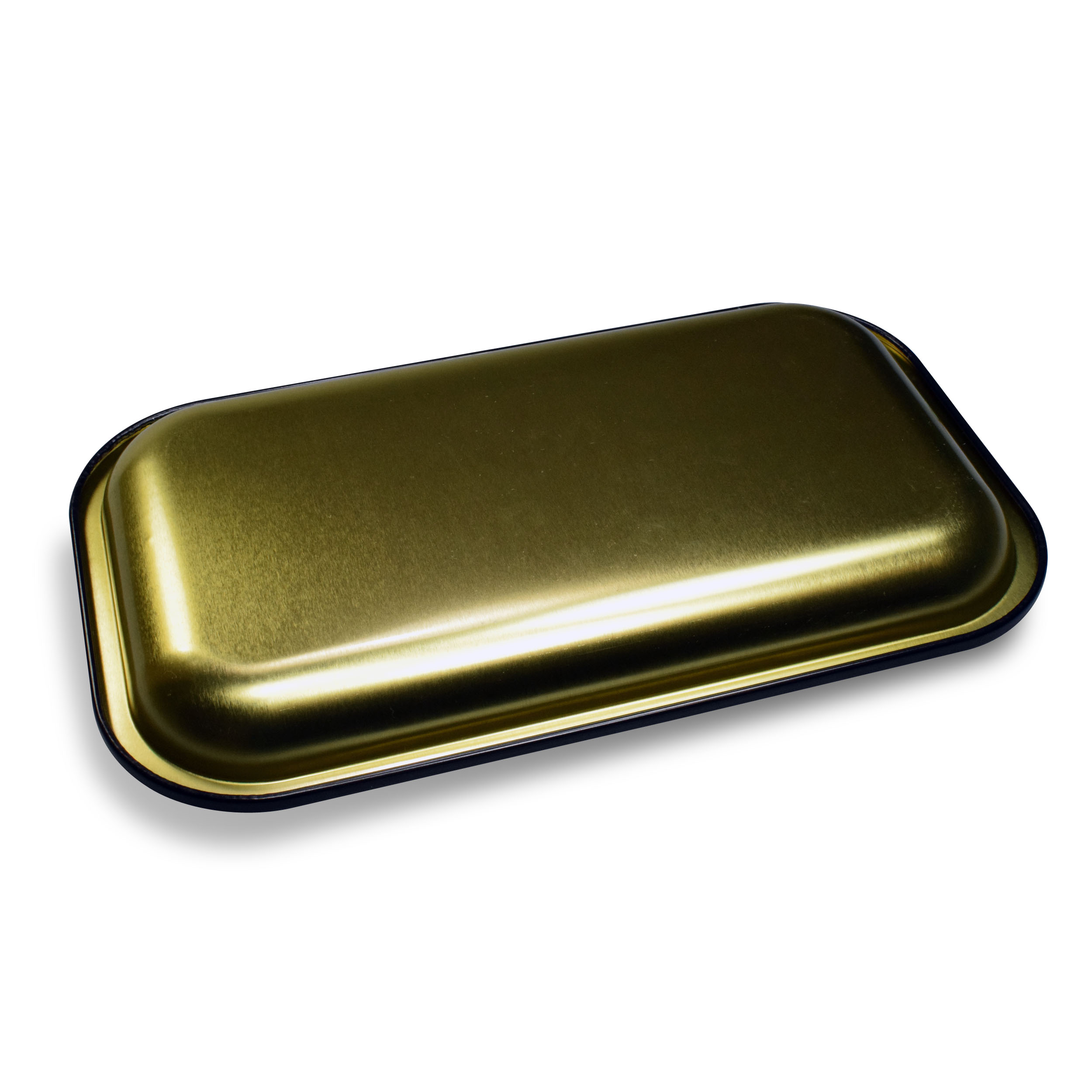 • One brushed gold metal tray. Measures 10-5/8 x 6-1/4 x 7/8. Material: gold tin. Individually polybagged